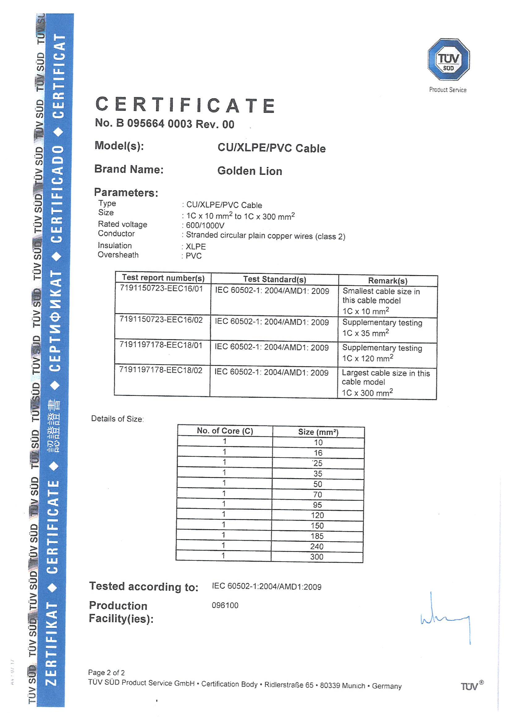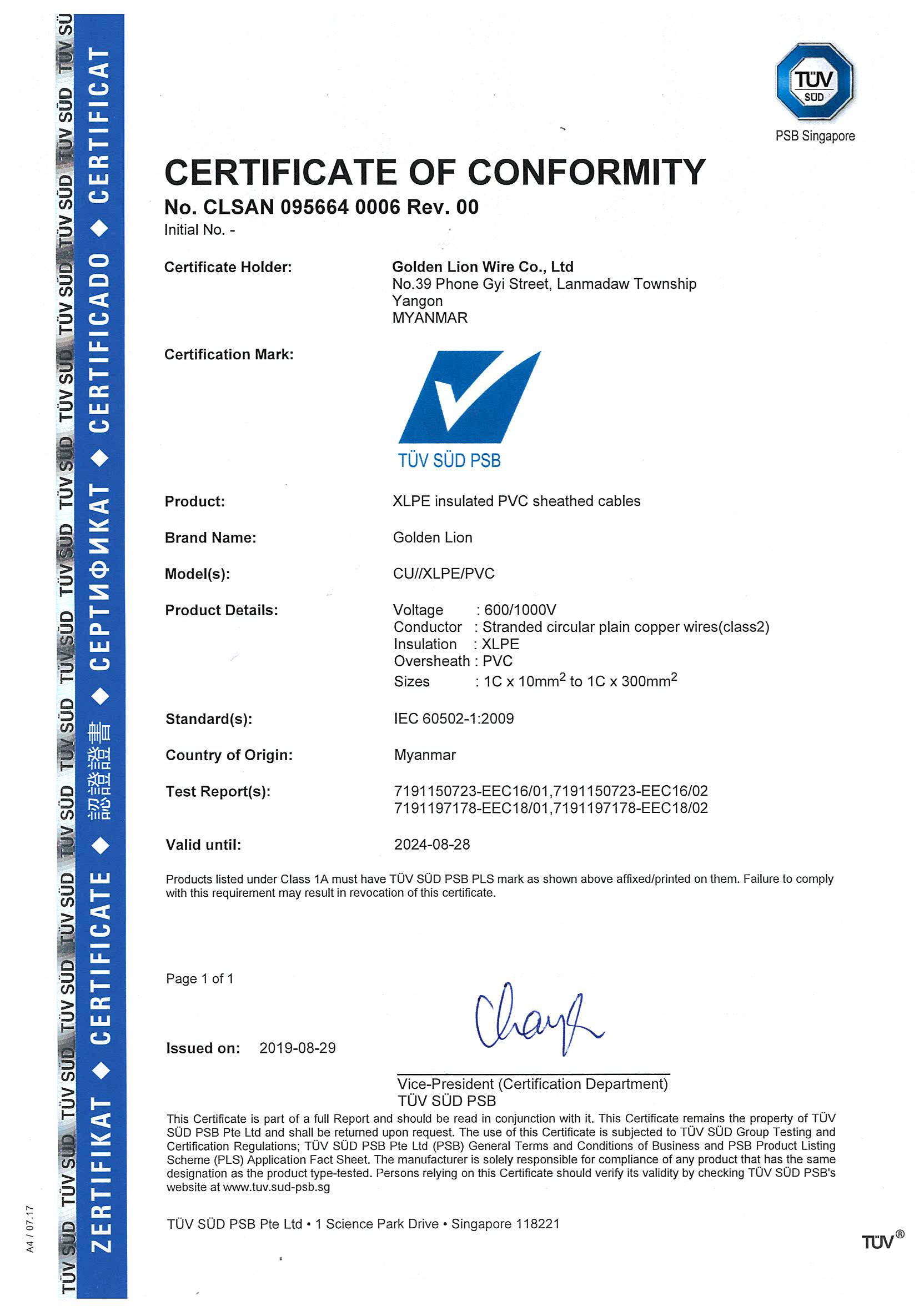 ကျွန်တော်တို့ Golden Lion Wire မှ ထုတ်လုပ်ထားတဲ့ Wire & Cable များဟာ IEC Standard များနဲ့အညီထုတ်လုပ်ထားတဲ့ Product များဖြစ်ပြီး ဂျာမနီနိုင်ငံ အသိအမှတ်ပြု၊ စင်္ကာပူအခြေစိုက် အရည်အသွေးအကဲဖြတ် စောင့်ကြည့်ရေးအဖွဲ့ TUB SUD PSB Pte Ltd မှ ထုတ်ပေးတဲ့ TUV Certificate များကိုလည်း ရရှိထားပါတယ်။